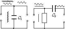 解:电容的作用是“通交流,隔直流”、“通高频,阻低频”,由其表达式XC=1/2πfC可看出:左图中的C1必须用电容小些的,才能使高频交流顺利通过,而低频不易通过,这种电容器叫高频旁路电容器。右图中的C2一般用电容大的,使低频交流电很容易通过,只有直流成分从电阻上通过,这种电容器叫隔直电容器。