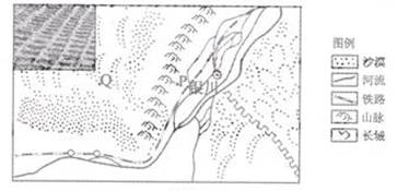图4是我国西部某地区略图,图中左上方所示为当地铁路沿线的草方格沙障。读图回答8--9题。![]()