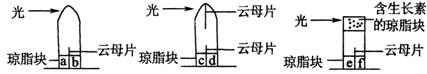 30.下面是有关燕麦实验的示意图。图中所示燕麦胚芽鞘的某些部位纵向插入了云母片。请分析下图a-f琼脂块中生长素的含量,对其含量关系的判断正确的是: