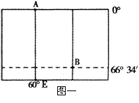 图中(图一)相邻两条经线的经度差为30度,A、B为晨昏线上的两点,太阳直射在西半球。据此完成1-3题。