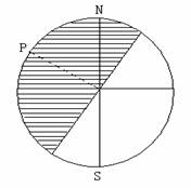 人们通常以经度00,380N为极点,将陆地相对集中的半球,称为“陆半球”,另一半球为“水半球”(如右图,P点为“陆半球”的极点,阴影代表“陆半球”)。据此回答1-3题。