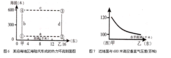 图6示意某沿海地区海陆风形成的热力环流剖面图,图7地区近地面与600米高空垂直气压差的分布状况,读图回答27-29题。