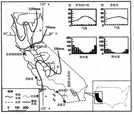 材料一 由于该州南方的降水量不足,自二十世纪初便开始进行大规模的资源调配工程建设,使南方农业得到发展。自1946年起,该州的农业生产居美国的第一。