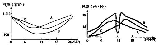 (4)下图为“麦莎”经过浙江境内的A、B、C三地观测到过境时的气压与平均风速随时间的变化规律示意图,“麦莎”中心是从A、B、C、三地中的 地过境的。(2分)