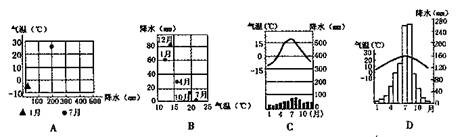 (1)下列四幅气候统计图中,表示斜线地区气候特点的是 。(2分)