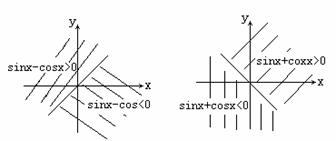注;利用单位圆中的三角函数线可知,以Ⅰ、Ⅱ象限角平分线为标准,可区分sinx-cosx的符号;