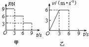 放在水平地面上的一物块,受到方向不变的水平推力F的作用,力F的大小与时间t的关系如甲图所示;物块的运动速度v与时间t的关系如乙图所示,6s后的速度图象没有画出,g取10m/s2。下列说法正确的是
