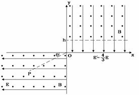 E的匀强电场,并在y>h的区域内有磁感应强度也为B的垂直于纸面向外的匀强磁场。一个带电量为q的油滴从图中第三象限的P点以某一初速度释放,恰好能沿PO方向做直线运动(PO与x轴负方向的夹角为θ=370),并从原点O进入第一象限。已知sin370=0.6,cos370=0.8,重力加速度g=10m/s2,问: