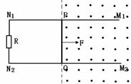 如图所示,M1N1N2M2是位于光滑水平面上的刚性U形金属轨道。导轨中接有阻值为R=5Ω的电阻,导轨和电阻的总质量为m0=0.5kg,导轨的两条轨道间的距离为L=0.1m,PQ是质量为m=0.1kg的金属棒,可在轨道上滑动,滑动时保持与轨道垂直,棒与轨道的接触是粗糙的,棒与导轨的电阻均不计。初始时,棒PQ位于图中的虚线上,虚线的右侧为一个匀强磁场区域,磁场方向垂直于桌面,磁感应强度的大小为B=10T,现有一位于导轨平面内的与导轨平行的恒力F=2N作用于PQ上,使之从静止开始在轨道上向右作加速运动,已知经过时间t=2s,导轨向右移动的距离为x0=2m,此时通过电阻的电流为I0=2A(导轨的N1N2部分尚未进入磁场区域)。求: