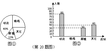 (本小题8分)某学校为了进一步丰富学生的体育活动,欲增购一些体育器材,为此对该校一部分学生进行了一次“你最喜欢的体育活动”的问卷调查(每人只选一项).根据收集到的数据,绘制成如下统计图(不完整):