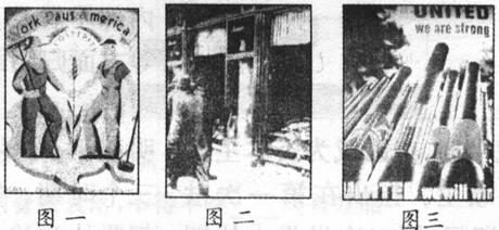 材料四 图三是美国的海报,图上的文字为“团结,我们就能强大”,“团结,我们就能获胜”。画面上有密密层层的巨炮在向天空轰击,驱散了空中浓重的阴霾。