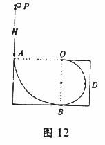 如图12所示.ABDO是处于竖直平面内的光滑轨道.AB是半径为R=15m的1/4圆周轨道,半径OA处于水平位置。BDO是直径为15m的半圆轨道.D为BDO轨道的中央。一个小球P从A点的正上方距水平半径OA高H处自由落下,沿竖直平面内的轨道通过D点时对轨道的压力等于其重力的