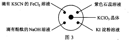12. 已知:KClO3 + 6HCl(浓) = KCl + 3Cl2↑ + 3H2O。如图3所示,将少量试剂分别放入培养皿中的相应位置,实验时将浓盐酸滴在KClO3晶体上,并用较大的表面皿盖好。下表中由实验现象得出的结论完全正确的是
