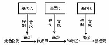 5、某生物的三对等位基因(Aa、Bb、Cc)分别位于三对同源染色体上,且基因A、b、C分别控制①②③三种酶的合成,在三种酶的催化下可使一种无色物质经一系列转化变为黑色素。假设该生物体内黑色素的合成必须由无色物质转化而来,如右图所示:现有基因型为AaBbCc的两个亲本杂交,出现黑色子代的概率为: