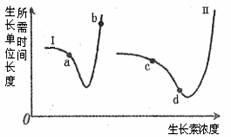 3、下图表示植物生长单位长度所需时间与生长素浓度的关系,正确的是:
