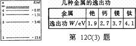 的能级时辐射光子的频率是 Hz,用这样的光子照射右表中几种金属,金属 能发生光电效应,发生光电效应时,发射光电子的最大初动能是 eV.(普朗克常量