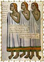 图2是中古时期的《三女神》画像。 中古时期,由于受到宗教上的束缚,人们并不欣赏人体美。作品中的三女神平板、单调、僵硬且面无表情。