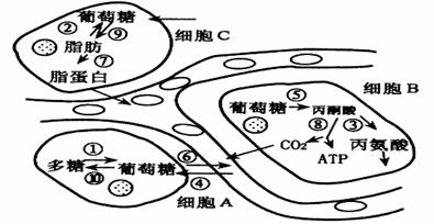 (2)在肝细胞A中,促进过程①的激素主要是 ,在肝细胞B中完成过程⑤和⑧的场所分别是 和 。产生的CO2 进入血液通过血液循环引起呼吸中枢的兴奋,并使呼吸加快,CO2对这种生理活动的调节方式叫 。在肝细胞C中参与过程⑦的物质有 和蛋白质。