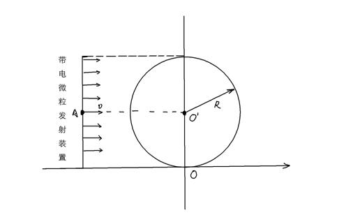 方法一:从任一点P水平进入磁场的带电微粒在磁场中做半径为R的匀速圆周运动,其圆心位于其正下方的Q点,如图b所示,这束带电微粒进入磁场后的圆心轨迹是如图b的虚线半圆,此圆的圆心是坐标原点为。