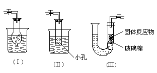 ,关闭导气管夹子时,气体可将液体从干燥管中压出,实现固-液脱离接触.(Ⅱ)中试管底部有小孔,液体可出入,固体不能漏出,其原理类似于(Ⅰ).(Ⅲ)中玻璃棉借助摩擦力而固定在管中,产生气体后,当关闭导气管夹子时,气体可将液体压入左管中,从而实验固-液脱离接触.