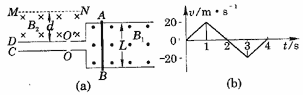 5. 如图a所示,两水平放置的平行金属板C、D相距很近,上面分别开有小孔O、O′,水平放置的平行金属导轨与C、D接触良好,且导轨在磁感强度为B1=10T的匀强磁场中,导轨间距L=0.50m,金属棒AB紧贴着导轨沿平行导轨方向在磁场中做往复运动.其速度图象如图b所示,若规定向右运动速度方向为正方向,从t=0时刻开始,由C板小孔O处连续不断以垂直于C板方向飘入质量为m=3.2×10-21kg、电量q=1.6×10-19C的带正电的粒子(设飘入速度很小,可视为零).在D板外侧有以MN为边界的匀强磁场B2=10T,MN与D相距d=10cm,
