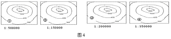 6、下图4所示四幅等高线地形图中等高距相同,水平比例尺不同,请判断坡度最陡的是哪一幅示意图