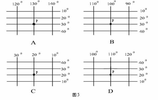 7、在图5所示A.B.C.D四幅图中,P点位置同时符合①东半球 ②北半球 ③低纬度 ④在我国境内这四个条件的图是