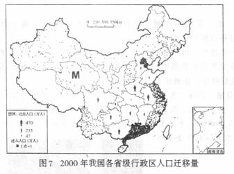 [解析]第1题主要是考查考生的读图能力,图例中人物的大小代表着人口迁移的数量得多少,由图可以看出中部地区迁出的人口数最多,主要是迁往东部沿海地区。第2题M地区属于我国的青海省,由于国家西部大开发的政策使得大量的人口迁向青海省。
