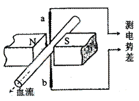 (09年宁夏卷)16. 医生做某些特殊手术时,利用电磁血流计来监测通过动脉的血流速度。电磁血流计由一对电极a和b以及磁极N和S构成,磁极间的磁场是均匀的。使用时,两电极a、b均与血管壁接触,两触点的连线、磁场方向和血流速度方向两两垂直,如图所示。由于血液中的正负离子随血流一起在磁场中运动,电极a、b之间会有微小电势差。在达到平衡时,血管内部的电场可看作是匀强电场,血液中的离子所受的电场力和磁场力的合力为零。在某次监测中,两触点的距离为3.0mm,血管壁的厚度可忽略,两触点间的电势差为160µV,磁感应强度的大小为0.040T。则血流速度的近似值和电极a、b的正负为