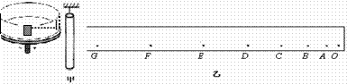10.(10分)如图甲所示,一个直径为d的纸筒, 固定在可以匀速转动的转台上,侧面开有位于竖直方向的狭缝,在转台的中心放有不随转台转动的油漆喷射器,它能以恒定速率水平向右喷射油漆,质量为2.00kg的金属长圆柱棒用白纸包着,当接通电源待电机稳定转动后,烧断悬挂圆柱棒的细线,圆柱棒自由下落,油漆可在圆柱棒的纸上留下记号。图乙是按正确操作获得的一条纸带,图中O是画出的第一个痕迹,A、B、C、D、E、F、G是依次画出的痕迹,测得痕迹之间沿棒方向的距离依次为OA =26.0mm、AB =50.0mm、BC =74.0mm、CD =98.0mm、DE =122.0mm、EF =146.0mm,已知电动机铭牌上标有“1200 r / min”字样,由此验证机械能守恒定律.根据以上内容,可得: