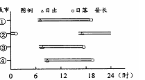 右图表示杭州、雅加达、伦敦、拉萨四城市某日日出、日落时刻北京时间)及昼长分布示意图,据此回答第33-34题。