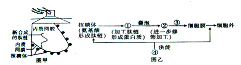 (7分)下图中甲图为细胞内质网结构局部放大模式图,乙图表示分泌蛋白合成和分泌的过程,请据图回答相关问题: