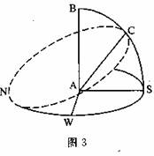 图3为“在A地地平面观察到的太阳视运动过程图”,其中虚线圈为太阳视运动轨迹,B为A地的天顶,C为太阳视运动某一位置。读图完成5-6题。
