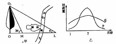 甲图中OM、OL分别是北半球某地树木OO1一年中正午日影最短和最长的影子,ML与河流PQ段正好垂直;乙图为P、Q两水站文测得河流流量的年变化曲线,回答14-15题。
