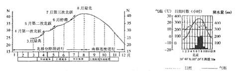 读“西北太平洋副热带高压脊与雨带位移示意图”和“北京多年平均气温、日照曲线与降水量柱状图”回答7-8题。