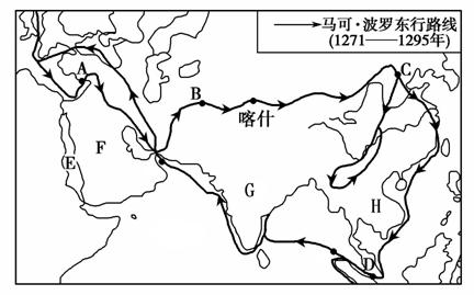 下图为“1271-1295年马可·波罗东行路线示意图”。读图回答下列问题。(16分)