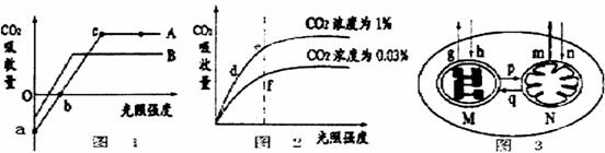 (17分)下列的图都与植物光合作用有关,图1表示A、B两种植物光合作用效率随光照强度改变的变化曲线;图2表示将A植物放在不同浓度CO2环境条件下,光合效率受光照影响的变化曲线:图3代表植物的一个叶肉细胞及其相关生理过程示意图。请据图回答:![]()