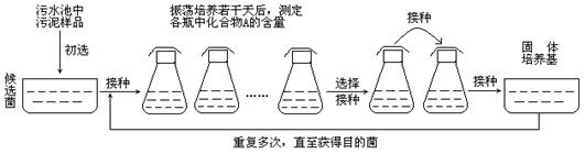 某化工厂的污水池中含有一种有害的难以降解的有机化合物A。研究人员用化合物A、磷酸盐、镁盐以及微量元素配制的培养基,成功筛选到能高效降解化合物A的细菌(目的菌)。实验的主要步骤如下图所示。请分析回答下列问题。