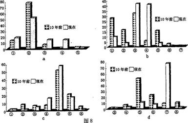 图8反映l0年前与现在北京市居民的日常用品、蔬菜食品、家用电器、普通服装购