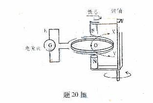 20.(09年重庆卷)题20图为一种早期发电机原理示意图,该发电机由固定的圆形线圈和一对用铁芯连接的圆柱形磁铁构成,两磁极相对于线圈平面对称,在磁极绕转轴匀速转动过程中,磁极中心在线圈平面上的投影沿圆弧
