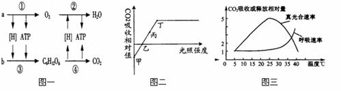 a、b为光合作用的原料,①~④表示相关过程。图二、图三表示外界相关条件对