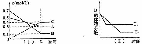 6.T°C时,A气体与B气体反应生成C气体。反应过程中A、B、C浓度变化如图(I)所示,若保持其他条件不变,温度分别为T1和T2时,B的体积分数与时间的关系如图(II)所示,则下列结论正确的是 ( )