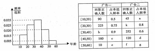 活动组织者为了解市民对这两则广告的宣传效果,随机对10~60岁的人群抽样了n人,统计结果如下图表: