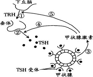 在神经和激素的调控下人体能够适应内外环境的变化。下图是甲状腺激素分泌调控模式图,主要包括①至⑤五个过程,其中TRH及TSH,分别表示促甲状腺激素释放激素和促甲状腺激素。请回答下列问题: