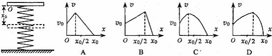 [例1]如图所示,一根轻弹簧竖直放在水平地面上,一个物块从高处自由下落到弹簧上端O,将弹簧压缩,弹簧被压缩x0时物块的速度变为零.从物块与弹簧接触开始,物块的速度υ,的大小随下降的位移x变化情况与下列四个图象中的哪一个比较一致?