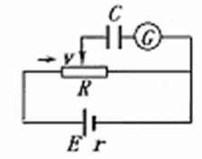 4.如图所示,将电动势E=1.5V、内阻r=0.5Ω的电源,与一粗细均匀的电阻丝相连,电阻丝的长度L=0.3m,电阻R=100Ω,当滑动片以v=5×10-3m·s-1的速度向右滑动时,电流表G的读数为多少?并指出电流表的正负极,已知电容器的电容C=2μF.