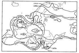 读欧洲早期铁路建设时间等值线分布图,回答5-6题: