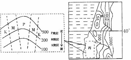 右图为某大洋东岸大陆等高线地形图;左图为丙区域的放大图,其中实线为等高线(单位:米),虚线为地层界线。回答24--25题。