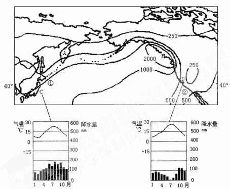 (1)比较A、B两地降水量的差异并分析原因(7分)