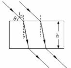 [例5]如图所示,一束平行单色光由空气斜射入厚度为h的玻璃砖,入射光束与玻璃砖上表面夹角为θ,入射光束左边缘与玻璃砖左端距离为b1,经折射后出射光束左边缘与玻璃砖的左端距离为b2,可以认为光在空气中的速度等于真空中的光速c.求:光在玻璃砖中的传播速度v.